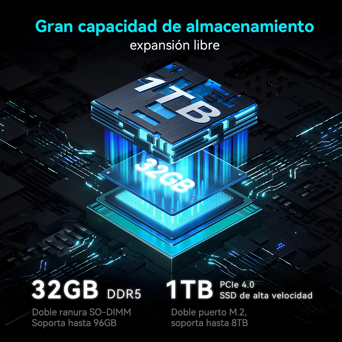 - Tipo de RAM: 2 ranuras de RAM SO-DIMM (DDR5-5600Mhz) expandible hasta 64 de RAM.