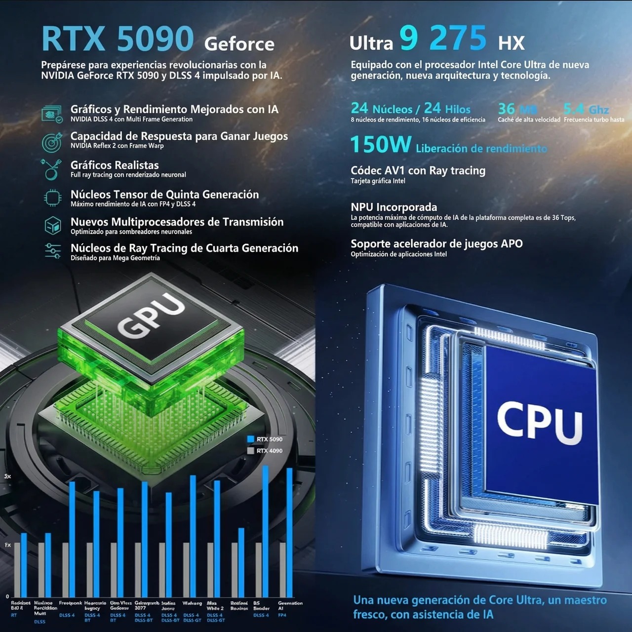 - CPU: Ultra 9 275HX de 24 núcleos y 24 hilos con una frecuencia de hasta 5.4Ghz y 36MB de caché inteligente soporta hasta 160W.